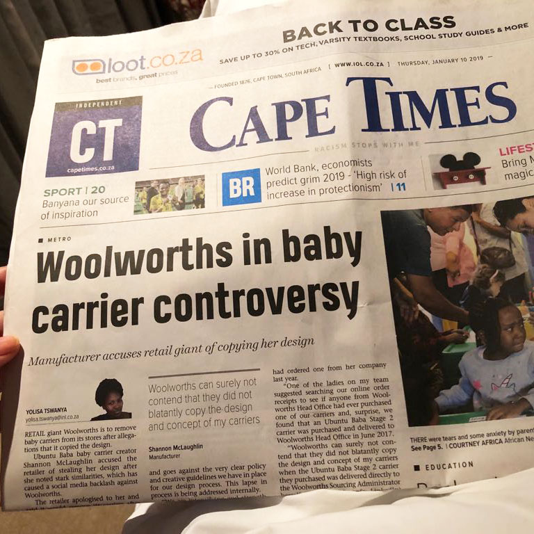blog post calling them out went viral, we received an outpouring of support. Our story hit front pages, national radio, and trended on Twitter, generating R13 million ($750,000 USD) in free media coverage and making Ubuntu Baba a household name overnight. As a result of the public outrage, Woolworths withdrew the product from their shelves, donated their profits to IP law education, paid damages to Ubuntu Baba, and donated the unsold carriers to parents in under-resourced communities.